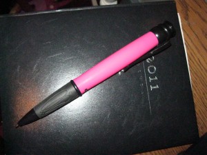 I was at Staples the other day and they had this huge pink pen. It’s great. I can always find it because its bigger than life (it has to be 10/12 inches long) and its fun to use! I’m thinking of going to get another one! Maybe bright green or they had some pretty printed ones.
